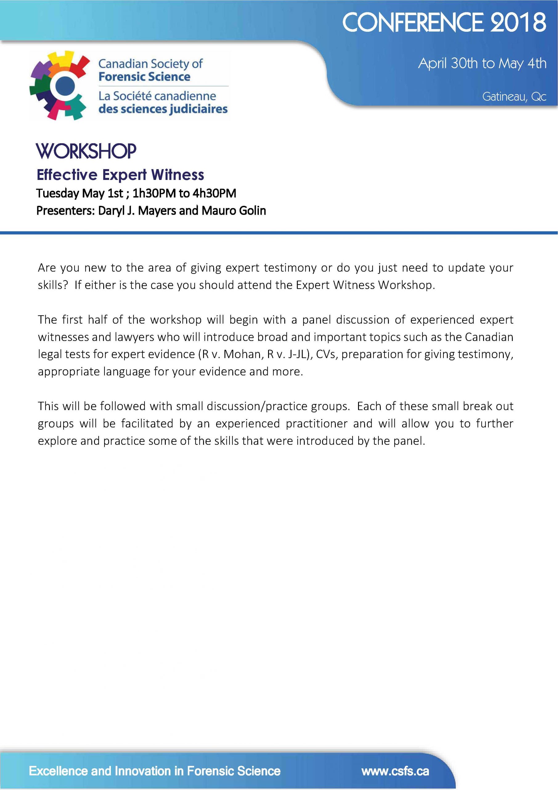 Brief Abstract: Are you new to the area of giving expert testimony or do you just need to update your skills? If either is the case you should attend the Expert Witness Workshop. The first half of the workshop will begin with a panel discussion of experienced expert witnesses and lawyers who will introduce broad and important topics such as the Canadian legal tests for expert evidence (R v. Mohan, R v. J-JL), CVs, preparation for giving testimony, appropriate language for your evidence and more. This will be followed with small discussion/practice groups. Each of these small break out groups will be facilitated by an experienced practitioner and will allow you to further explore and practice some of the skills that were introduced by the panel.